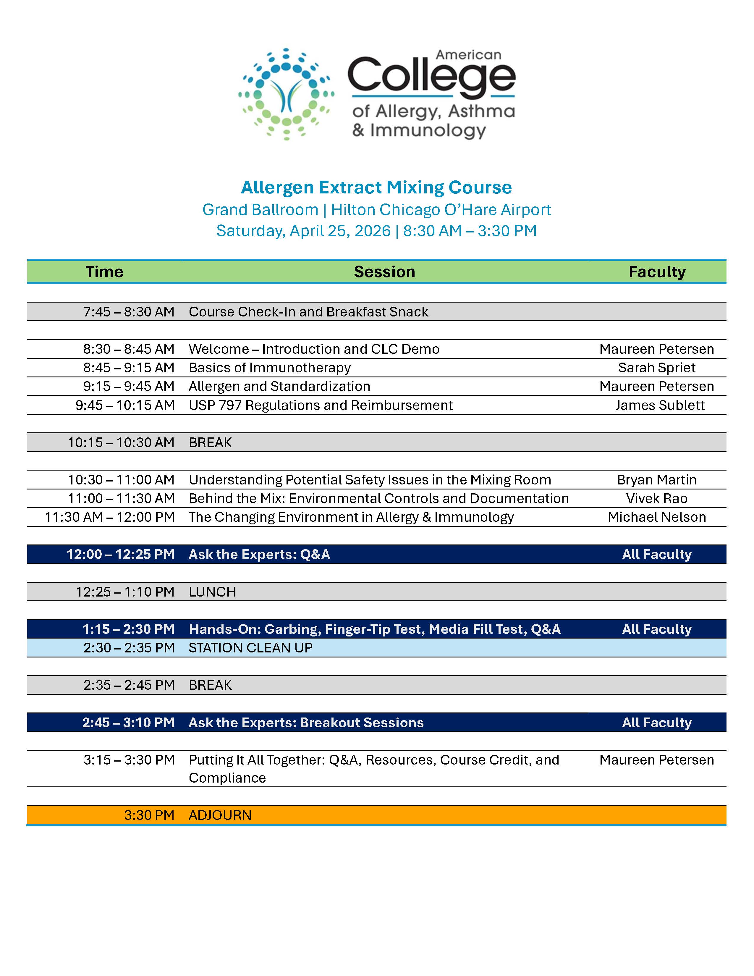 NOTE: Only registered participants will be admitted to the 2026 Allergen Extract Mixing Course on Saturday, April 25. Walk-ins and non-registrants will not be admitted.